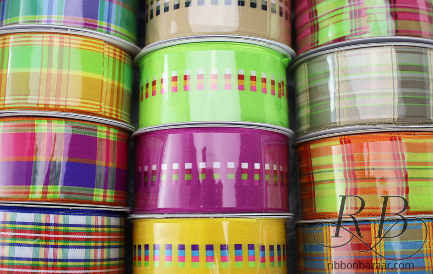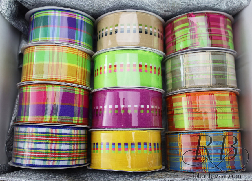 - Set of 12 diverse wired plaid ribbon spools