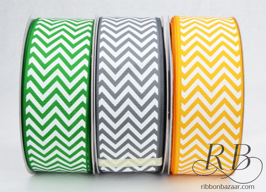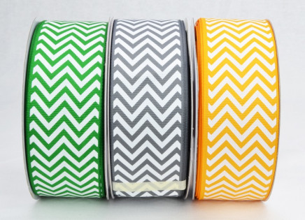 • Classic chevron pattern printed on 1-1/2" wide grosgrain ribbon.Available in three colors: metal gray, emerald & yellow gold.Made from 100% polyester so shrinkage is less than 2%.