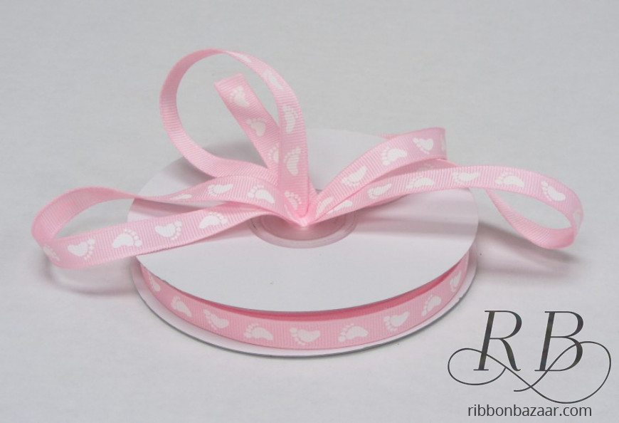 - Cute baby feet print on grosgrain ribbon.Made from 100% polyester so it won't shrink more than 2%.3/8" ribbon is offered in blue and pink.