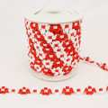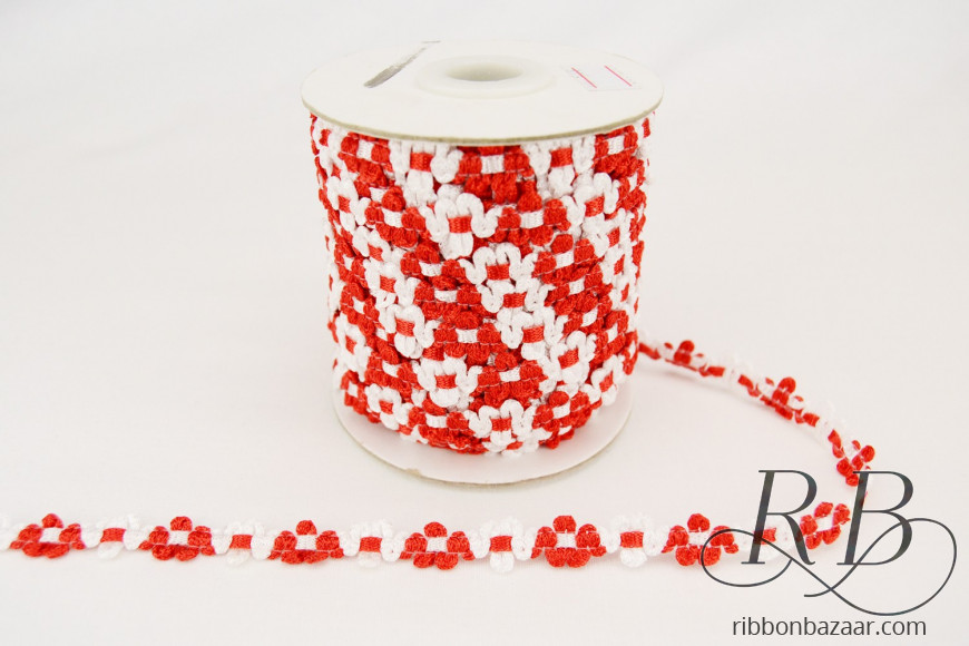 - This red & white trim features a lovely flowery embroidery around a 1/8" ribbon.