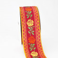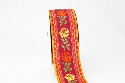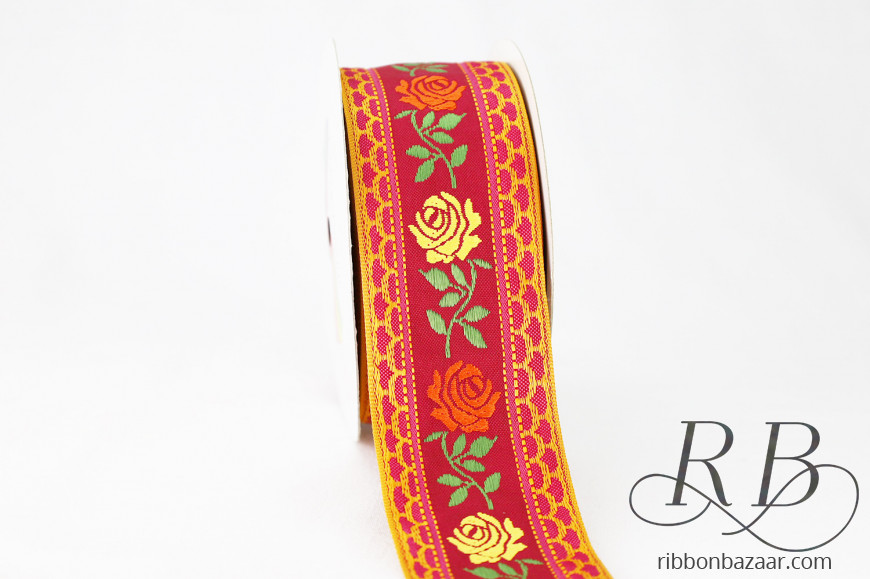 Vintage Rose Floral Ribbon - Burgundy Woven Trim with Yellow & Orange Embroidered Flowers