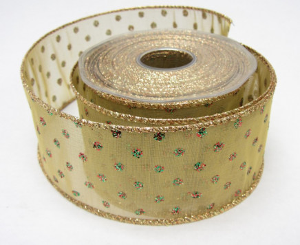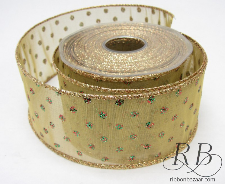 When you require a shiny, lightweight, high quality ribbon capable of retaining its shape for extended periods of time, few selections rival the beauty of sheer metallic dots. The attractively displayed regular dots arrayed across a see-through golden background make a truly memorable impression. The carefully crafted gold metallic border along both edges of the glitter dot ribbon help this sheer material retain its shape well without fraying. Available in 2-1/2 and 6 inch widths as a fashion accent or a craft project addition, this stunning sheer gold ribbon offers excellent value. Use it to enhance your designs in a stylish, permanent way whenever you require a decorative, thin ribbon with enduring impact.